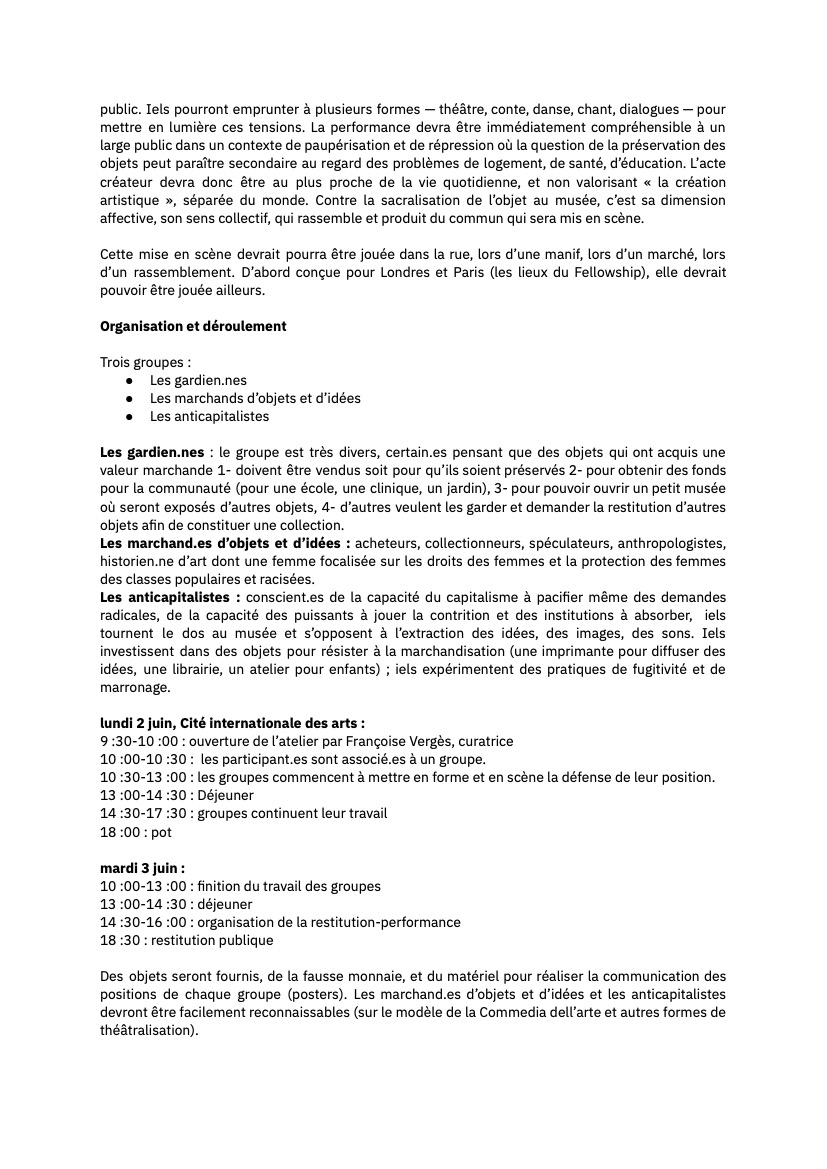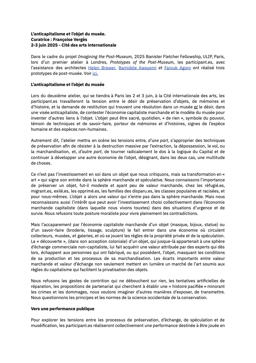 Following a long conversation between the participants during the first public workshop at Whitechapel Gallery in London in April 2025, Françoise identified two main positions: The first considers that preservation is important, that museum collections contain extremely valuable artistic and cultural heritage from Africa, Asia, Europe, the Americas, Oceania and the Caribbean. That losing them would be terrible, constituting an irreparable loss of memory and history, practices, technologies, and creativity. For not all collections consist of looted artworks and heritage, and the peoples and communities of the South would be the first to be deprived of traces of their culture. Examples of museums working closely with communities were cited. The second considers that the capitalist commodification process that transforms sacred and mundane objects into “art” must be radically questioned. For racial capitalism is based on the sacred principle of private property (even in public museums), on extraction and dispossession. The museum denies common ownership; it is inscribed in systems of banking, insurance and speculation; it is built on high-value land, sometimes expropriated. That the museum is a reserve for capitalist accumulation, and its fictitious neutrality hides structural violence, racism and exploitation (of maintenance workers, guards and staff). That reforms only serve to merely mask the systemic violence of its violent origins. These two positions—the need for a space to preserve and protect community heritage and the need for a more radical anti-capitalist transformation of society, —were the focus of the workshop held in Paris on 2 and 3 June. Drawing on a theory of street theatre, as described by Brazilian dramaturge Augusto Boal, the workshop sought to work through these two positions through the medium of performance.