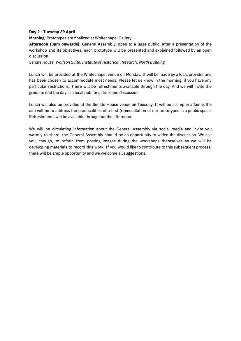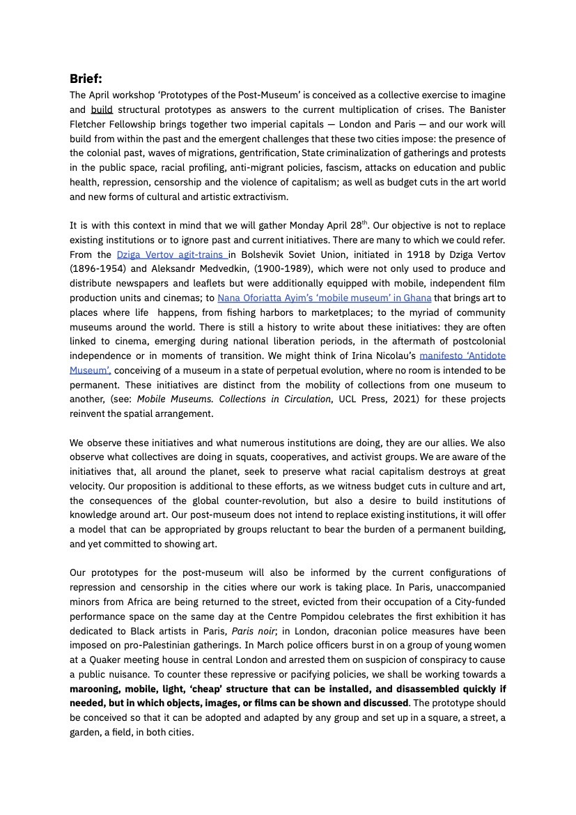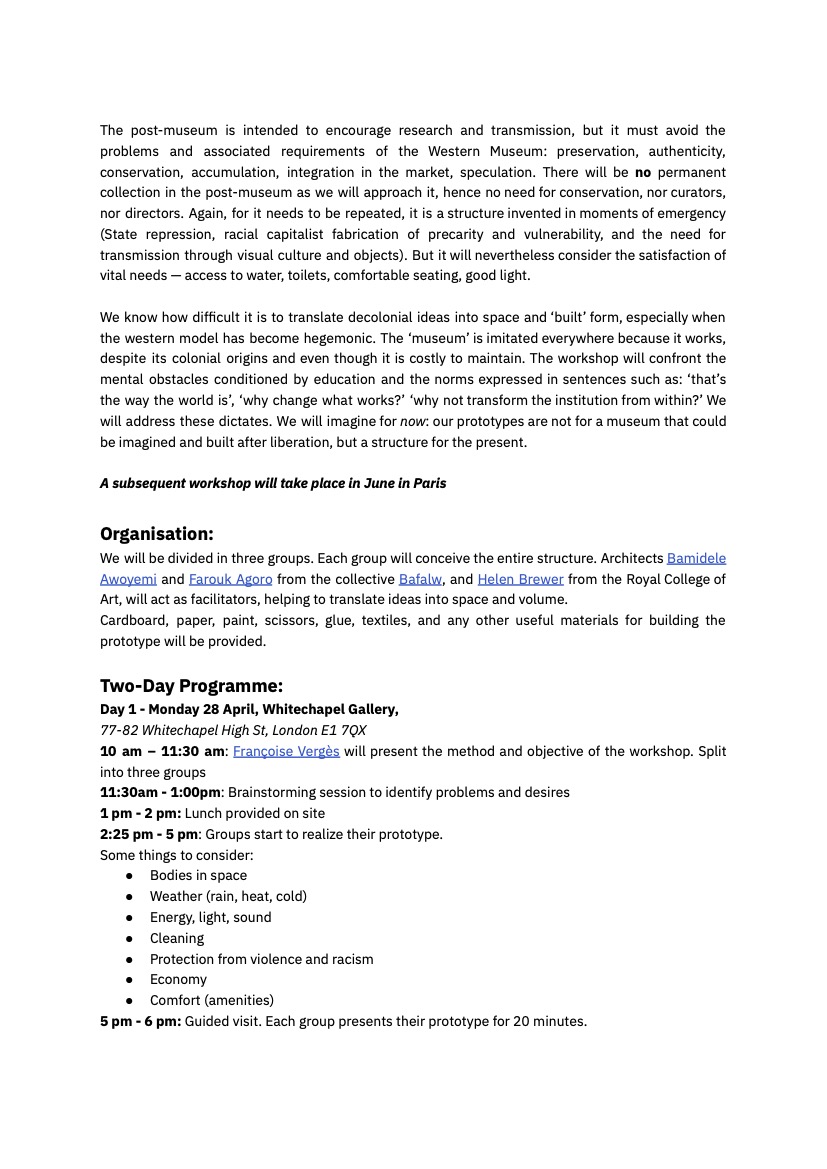 Following the preliminary meeting that took place in February 2025, the first workshop was organised at the Whitechapel Gallery in London in April. Participants were invited to join architects Farouk Agoro, Bamidele Awoyemi and Helen Brewer to build three different prototypes that would render concrete some of the ideals of the post-museum. Below is the invitation and briefing for participants. Here you will find images of their work.