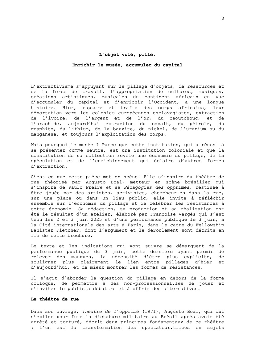Cette pièce, destinée à être jouée par des artistes, activistes, chercheur.es dans la rue, sur une place ou dans un lieu public, invite à réfléchir ensemble sur l’économie du pillage et de célébrer les résistances à cette économie. Sa rédaction, sa production et sa réalisation ont été le résultat d’un atelier, élaboré par Françoise Vergès qui s’est tenu les 2 et 3 juin 2025 et d’une performance publique le 3 juin, à la Cité internationale des arts à Paris.